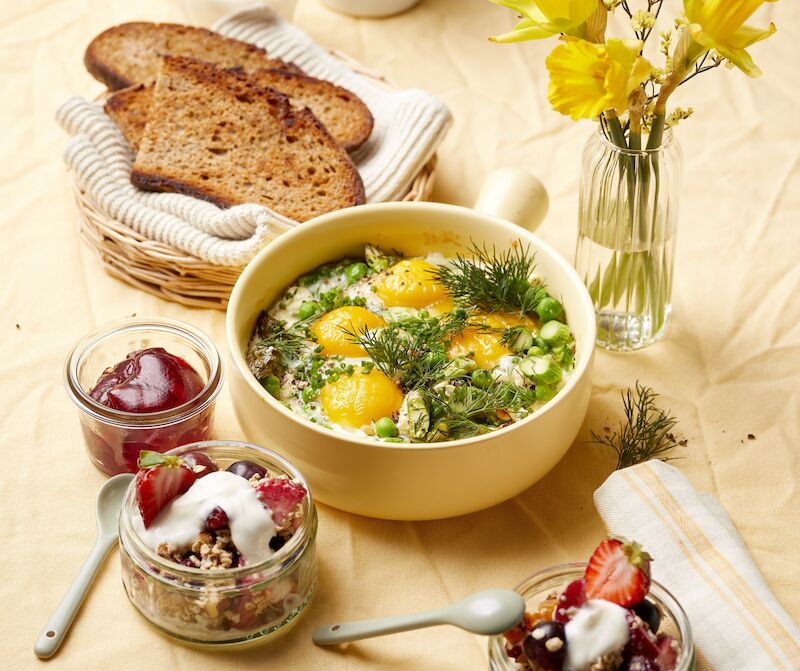 Baked eggs with asparagus, peas & feta >>