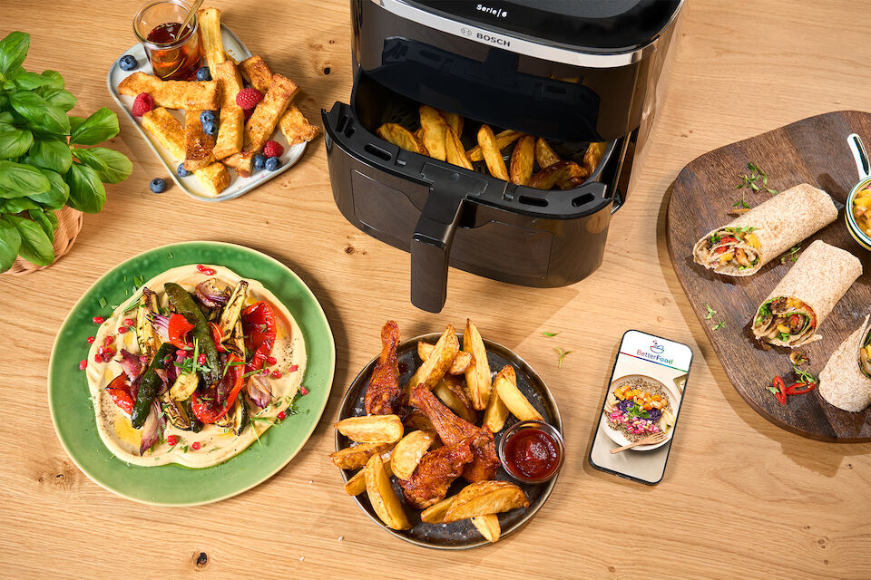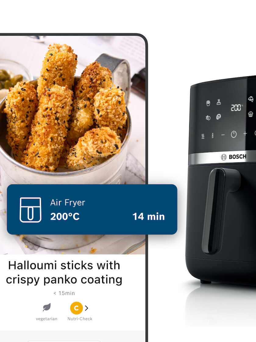 Naturalmente le nostre friggitrici ad aria Bosch possono essere utilizzate in qualsiasi momento manualmente, senza l’utilizzo dell‘app. Tuttavia, con le ricette Bosch BetterFood ottieni impostazioni precise e personalizzate per il tuo modello e puoi cucinare senza stress.