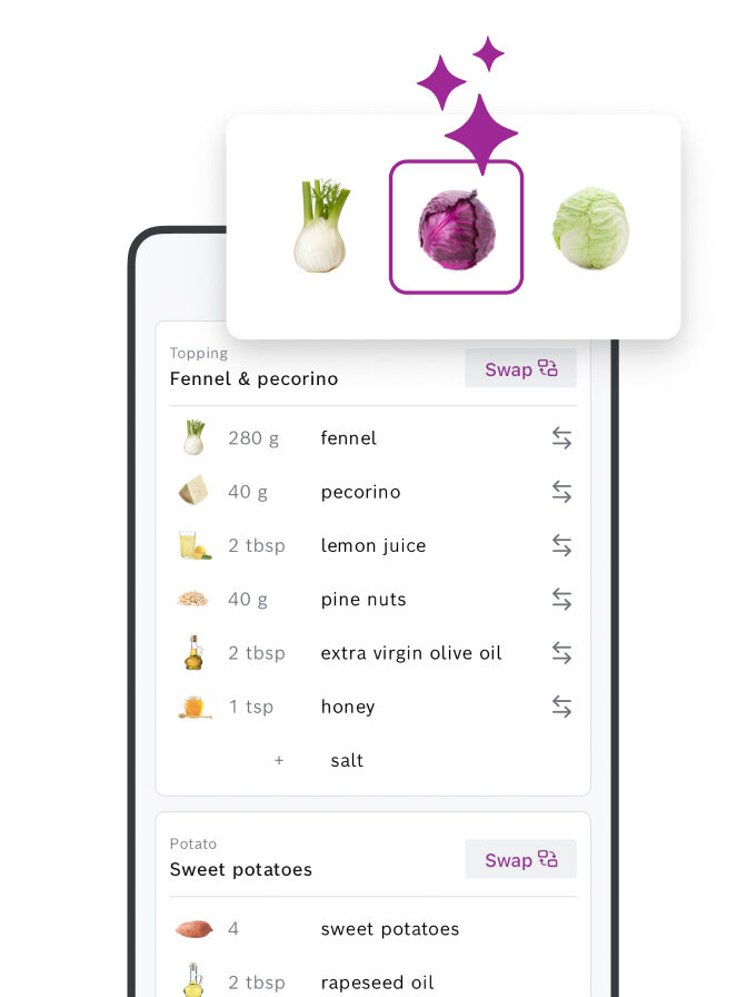 In più, l’app ti propone impostazioni ideali per i tuoi elettrodomestici Bosch e ti permette di personalizzare ogni piatto in base ai tuoi gusti o alle tue esigenze alimentari. Con Bosch BetterFood, ogni ricetta diventa più flessibile, salutare e su misura per te.